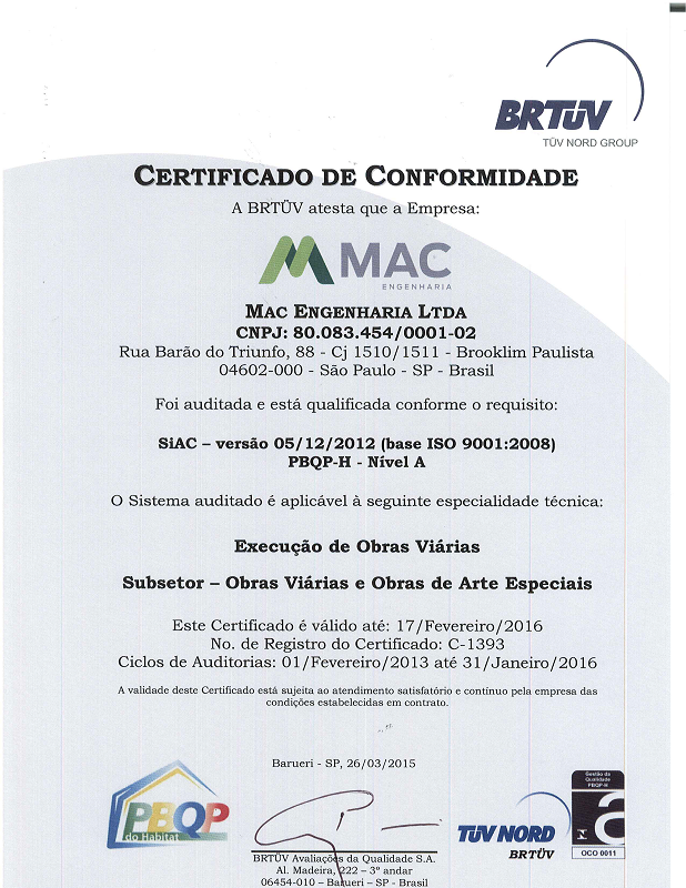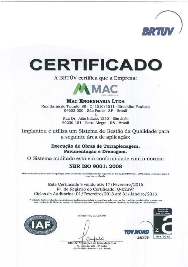 Atuando inicialmente na região sul, em obras de pavimentação e terraplenagem, a MAC Engenharia evoluiu ao mesmo tempo em que foi reconhecida pelo mercado. Depositando o potencial do seu capital humano na qualidade do seu trabalho, a empresa passou a executar demais obras de infraestrutura viária, de arte especial e de saneamento. O crescimento acompanhou a empresa, dando origem ao Grupo MAC, cujas atividades se estenderam por outros ramos de negócio, como a locação de equipamentos e britagem. Hoje, o Grupo MAC possui abrangência nacional e opera em diversos Estados do Brasil atendendo a clientes públicos e privados e executando projetos de infraestrutura fundamentais ao desenvolvimento do país. Seu maquinário e instalações são expressivos e fazem frente ao volume e complexidade das obras em que atua, além da capacidade inestimável do seu capital humano. Com passos firmes na qualidade, as obras viárias da empresa são certificadas nas normas ISO9001:2008 e PBQP-H, uma vez que a empresa utiliza seu Sistema de Gestão para evolução contínua de suas práticas e com ênfase na qualidade do seu produto, bem como no respeito aos requisitos legais de Segurança e Meio Ambiente.
